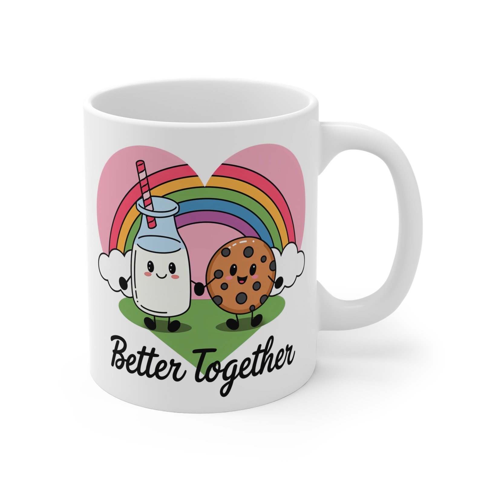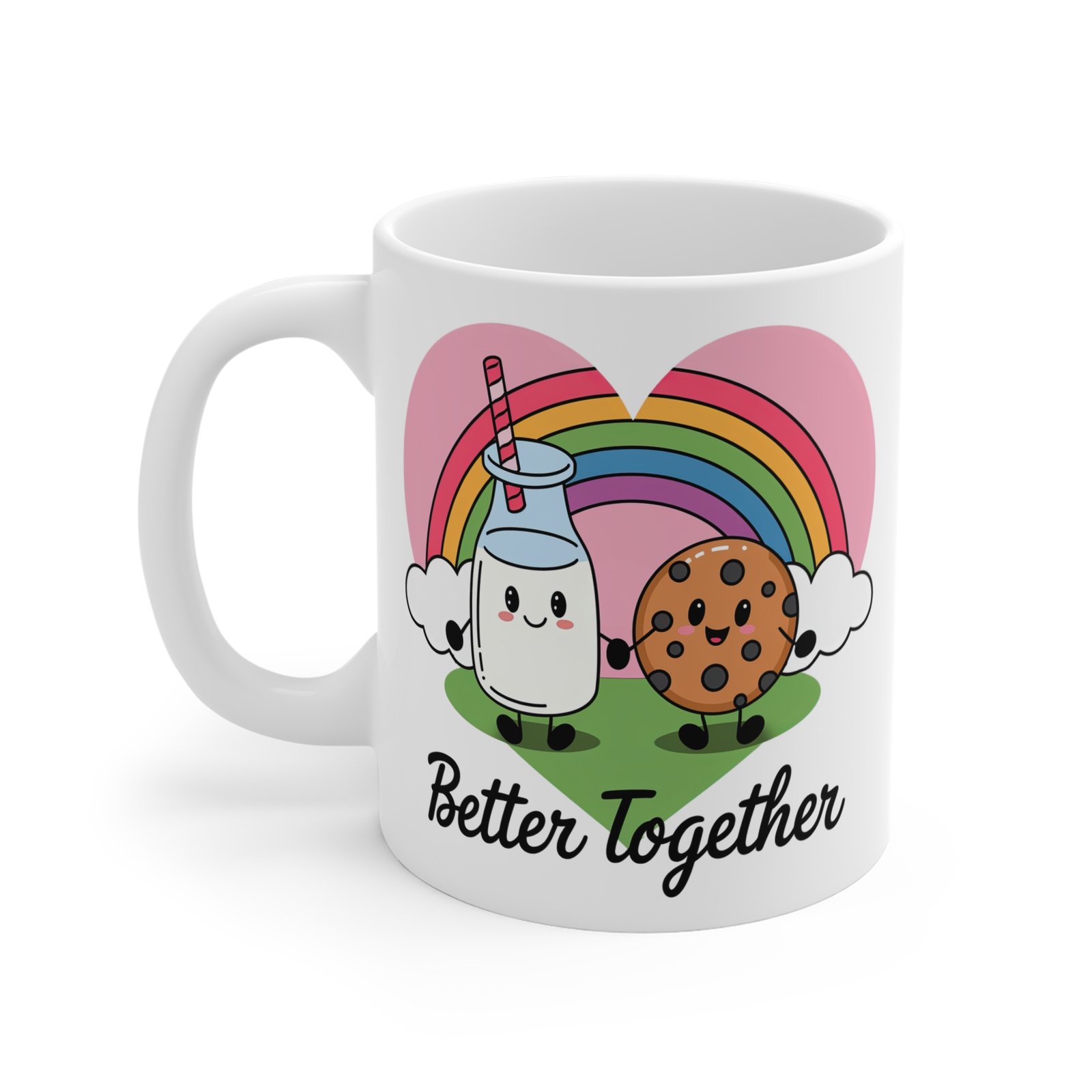 Brighten your day with this adorable “Better Together” mug! Featuring a charming kawaii design of a smiling milk bottle and chocolate chip cookie holding hands under a vibrant rainbow, this mug is perfect for couples, best friends, or anyone who loves fun and playful designs. Ideal for coffee, tea, or hot cocoa, it makes a thoughtful gift for Valentine’s Day, anniversaries, or everyday use. Durable and easy to clean, this mug brings a little extra sweetness to your favorite beverage.