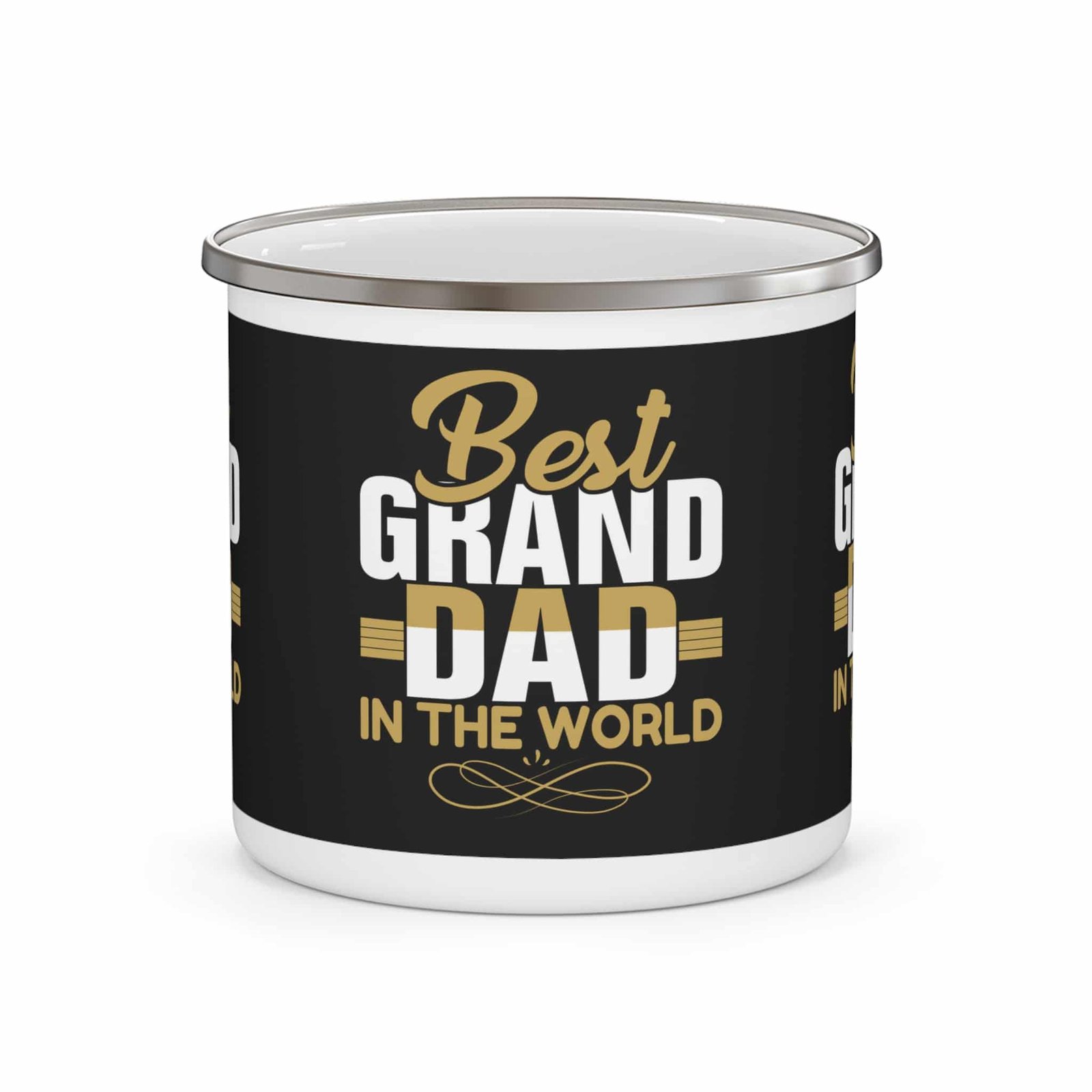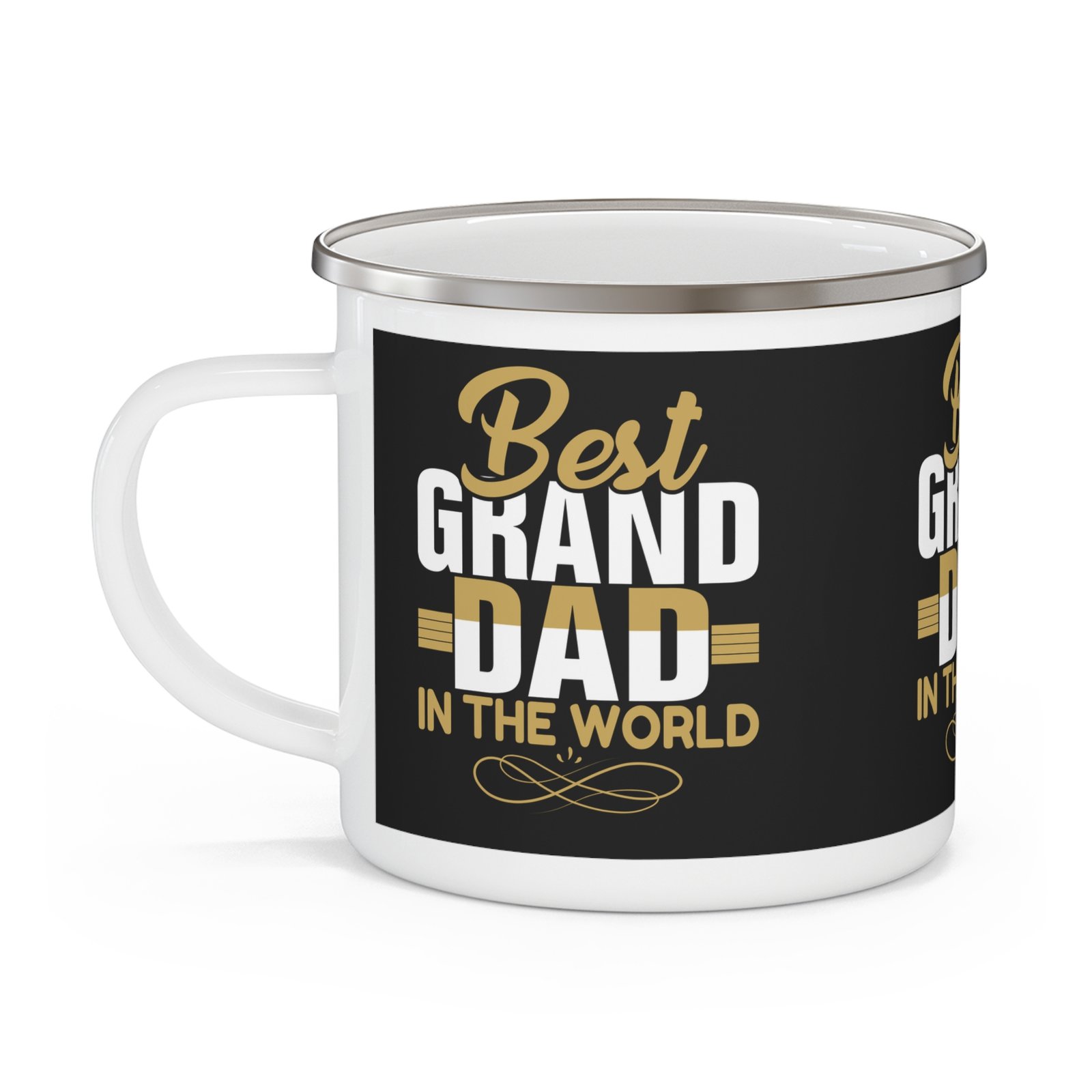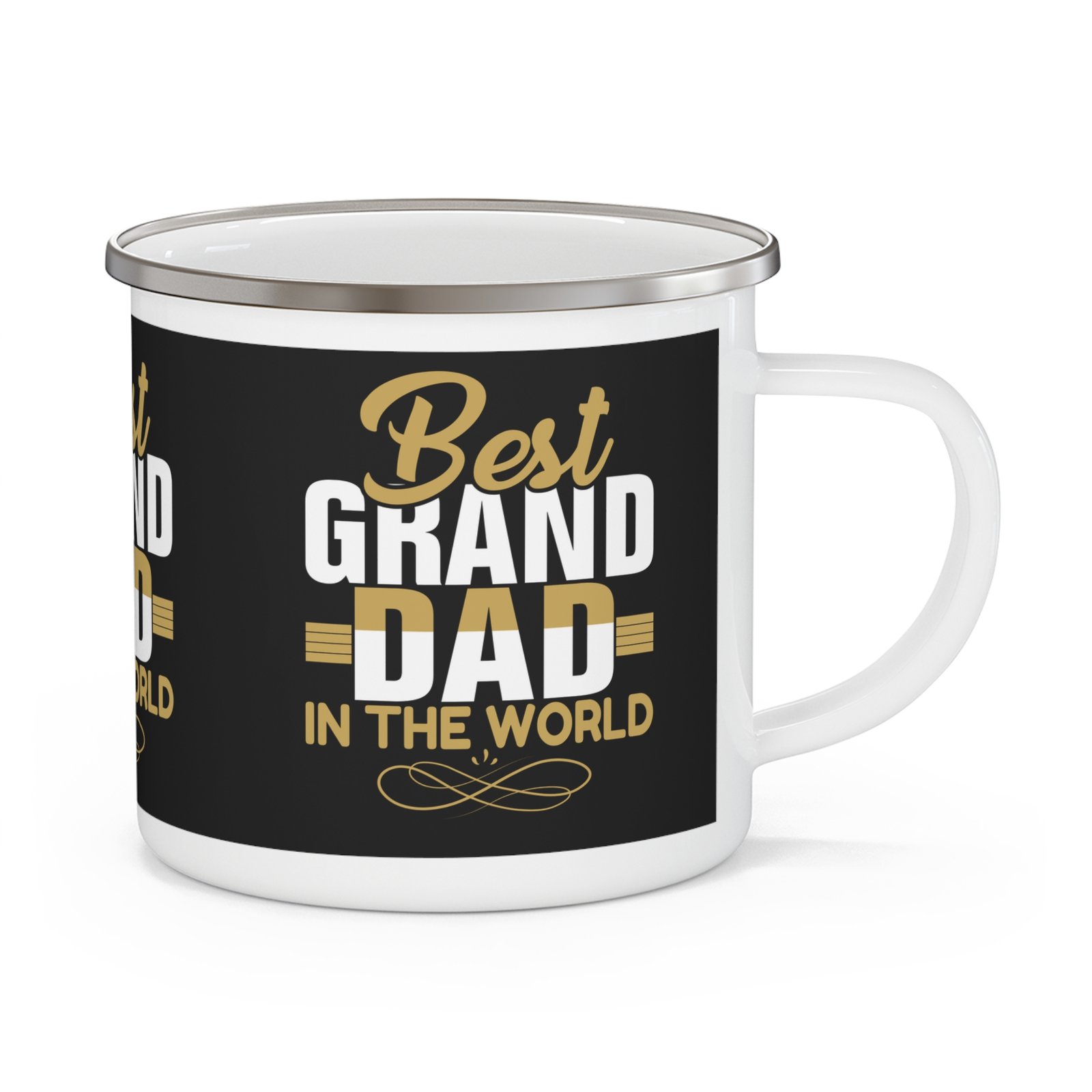A black enamel mug with the wording ‘Best Grand dad in the world’ in gold and white, perfect for Father’s Day. Gives a warm and heartfelt vibe, suitable for grandsons and granddaughters looking to show appreciation to their grand dad. Relevant for Father’s Day.