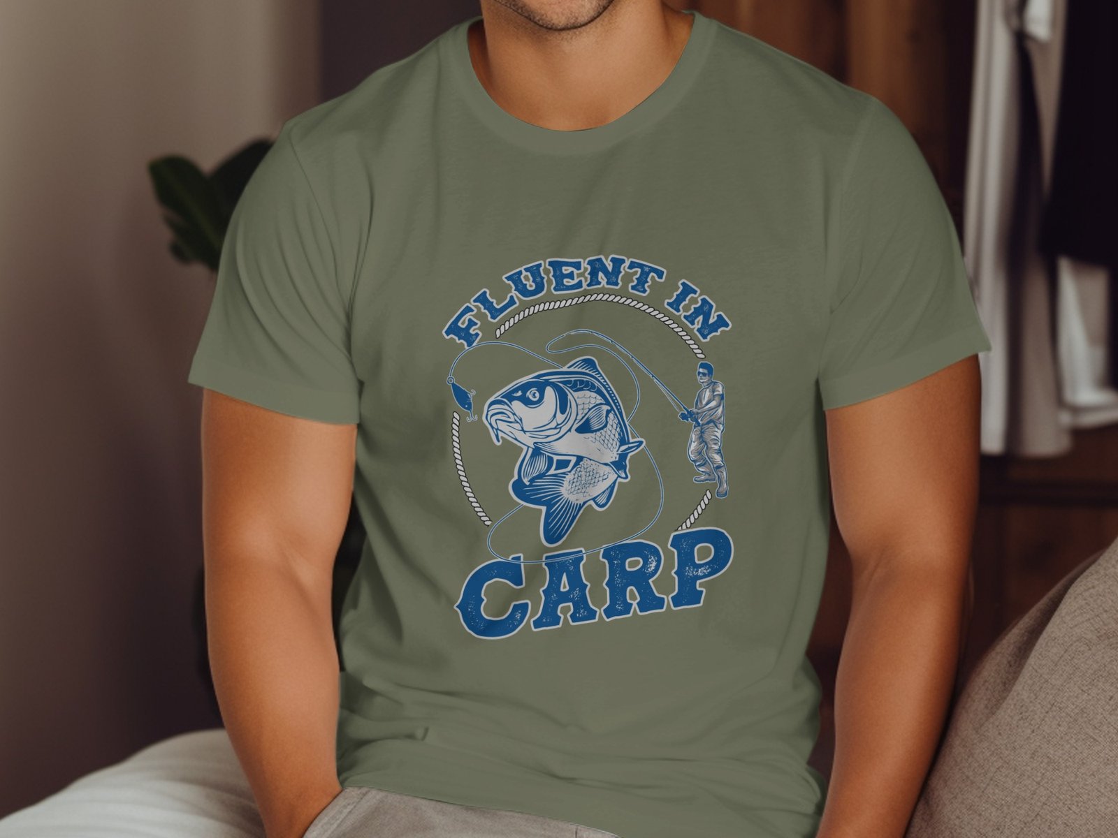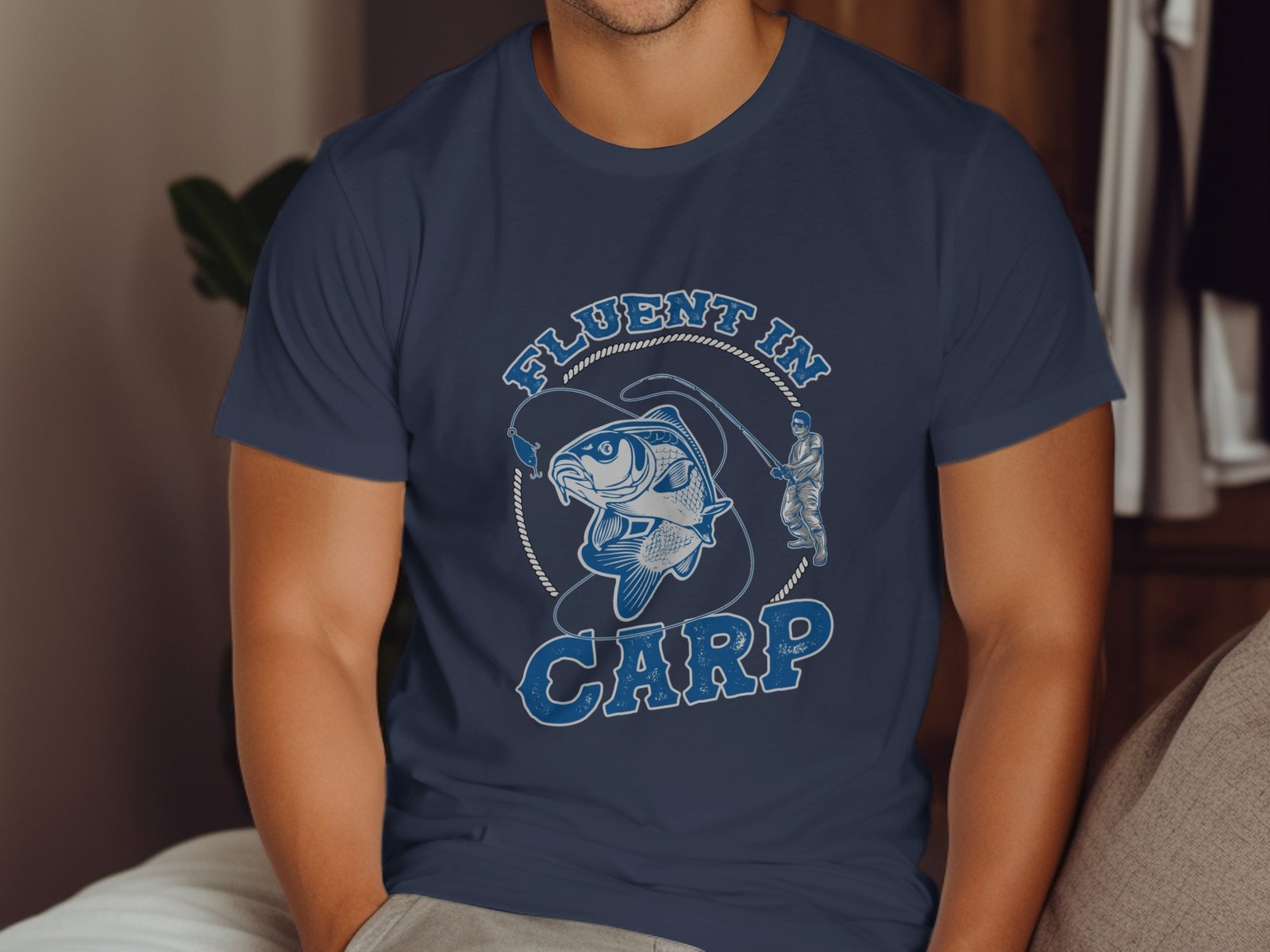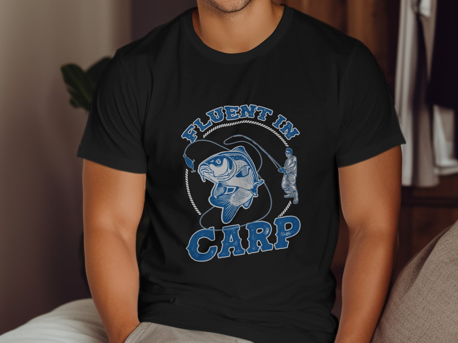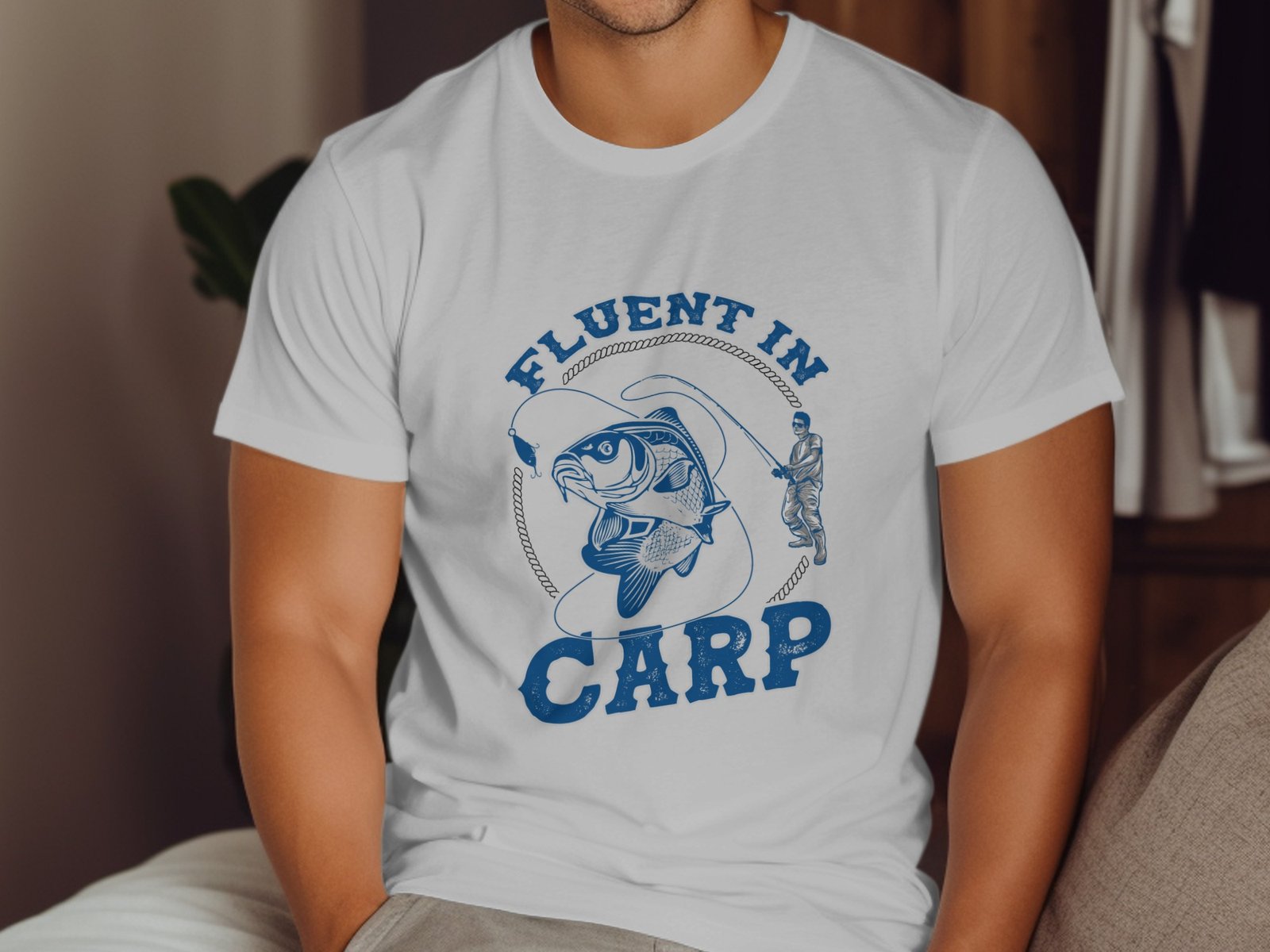 Show off your passion for fishing with this humorous graphic! This design features a fisherman carp a hook and the phrase Fluent In Carp. Great for anglers, order now.
