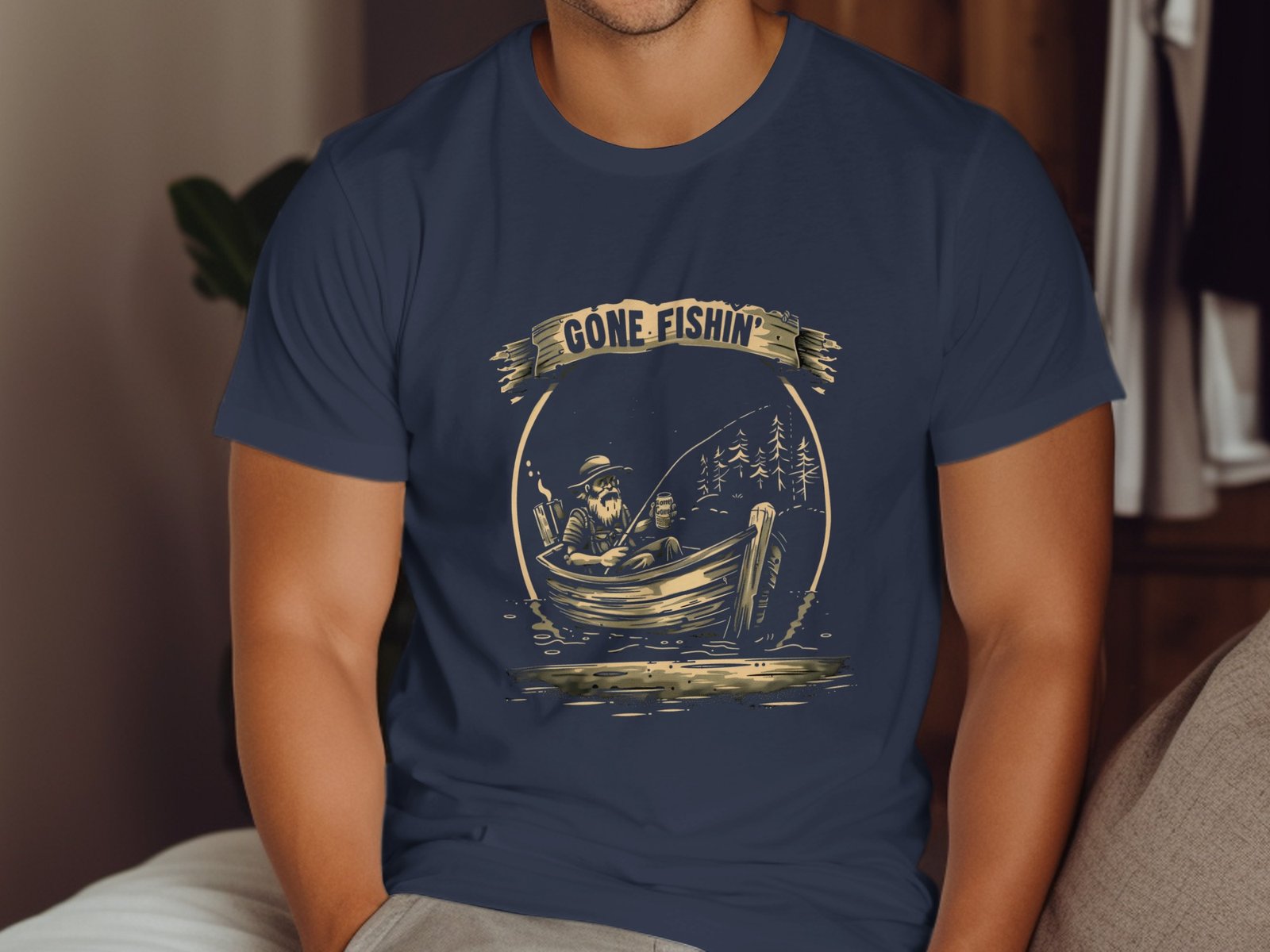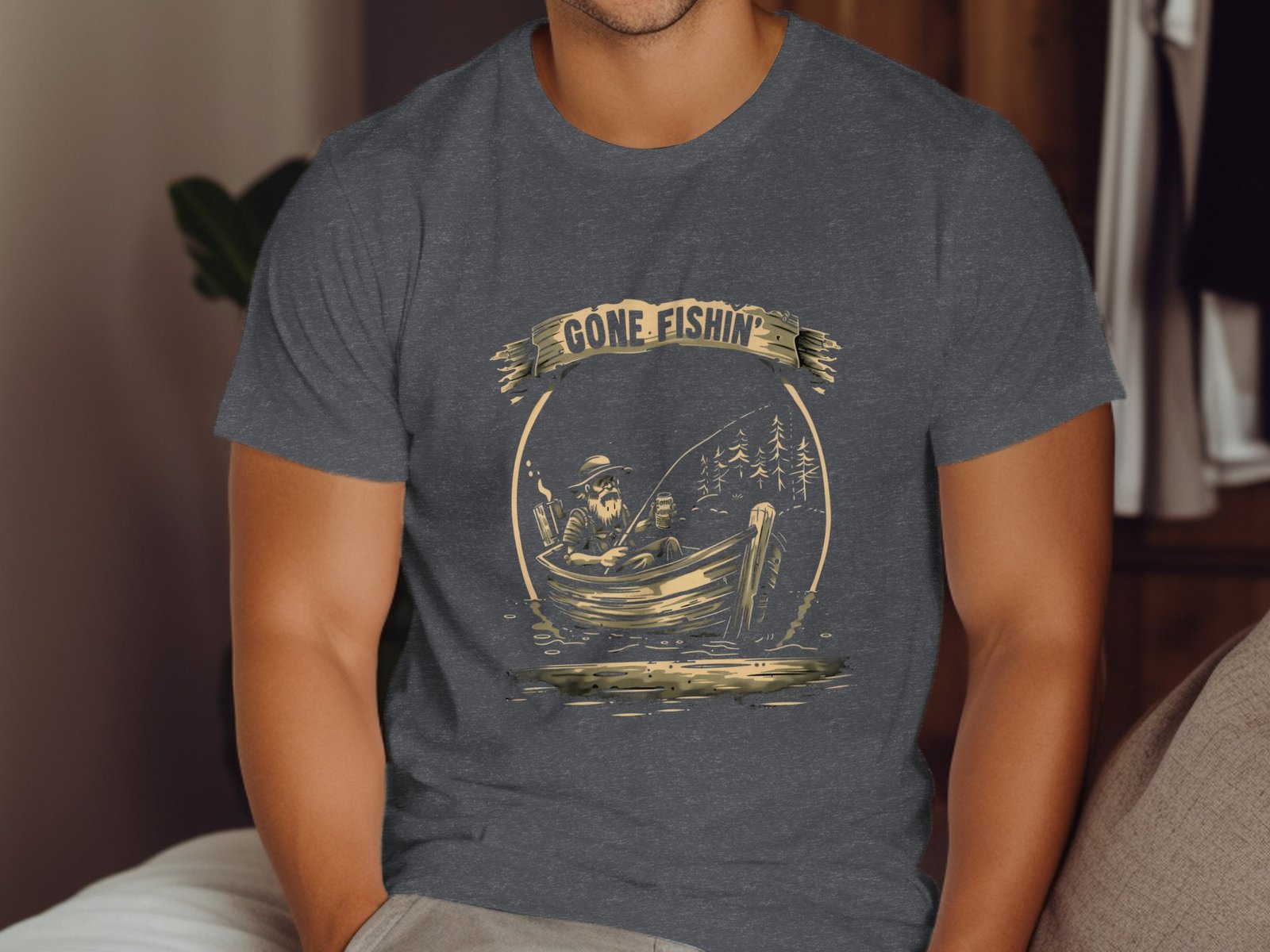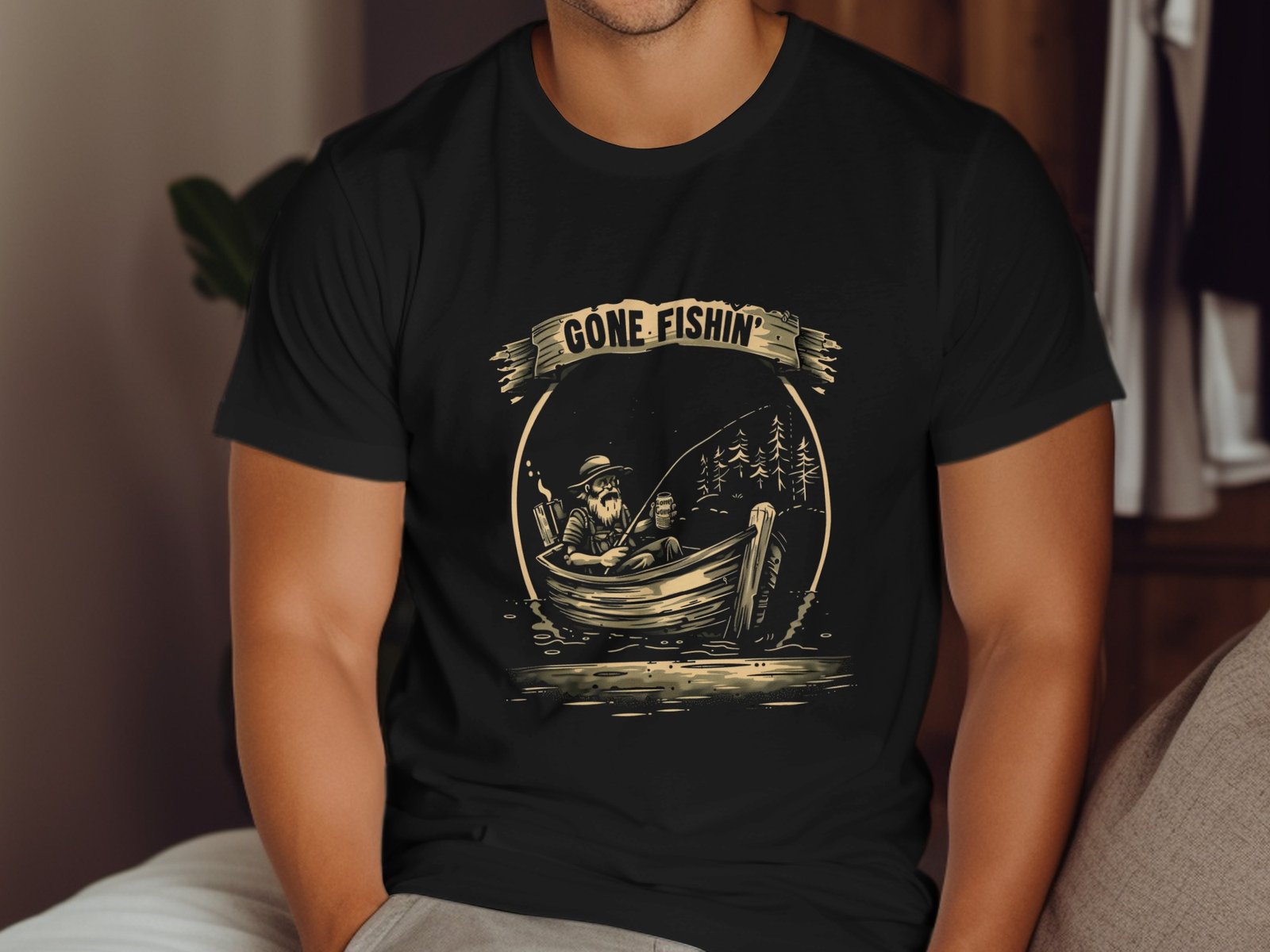 Get your Gone Fishin T-Shirt featuring fisherman with a boat on river design. Perfect for fishing trip and enjoying the great outdoors. Great gift for fishing enthusiast!