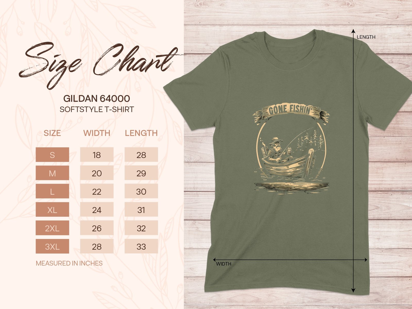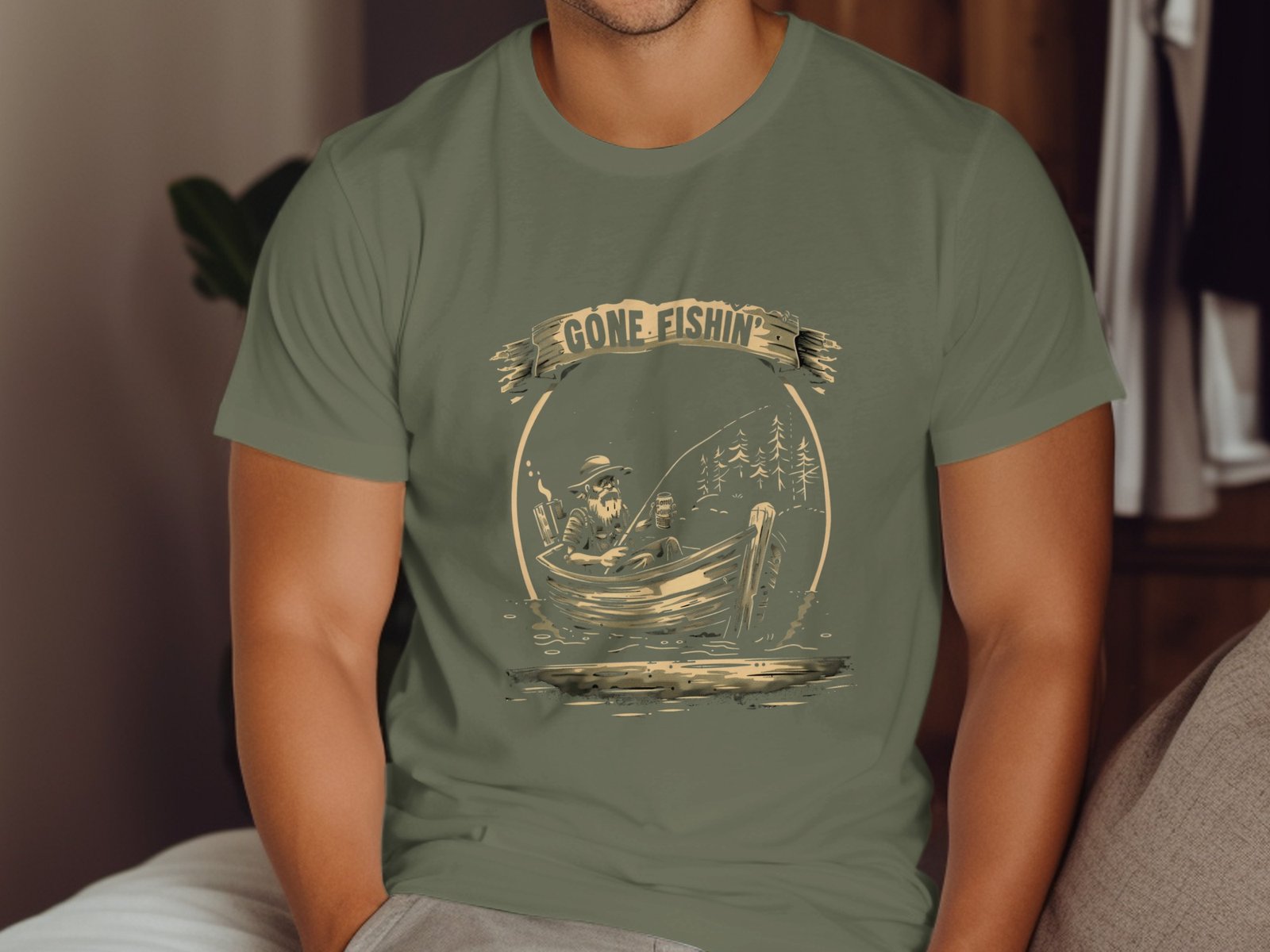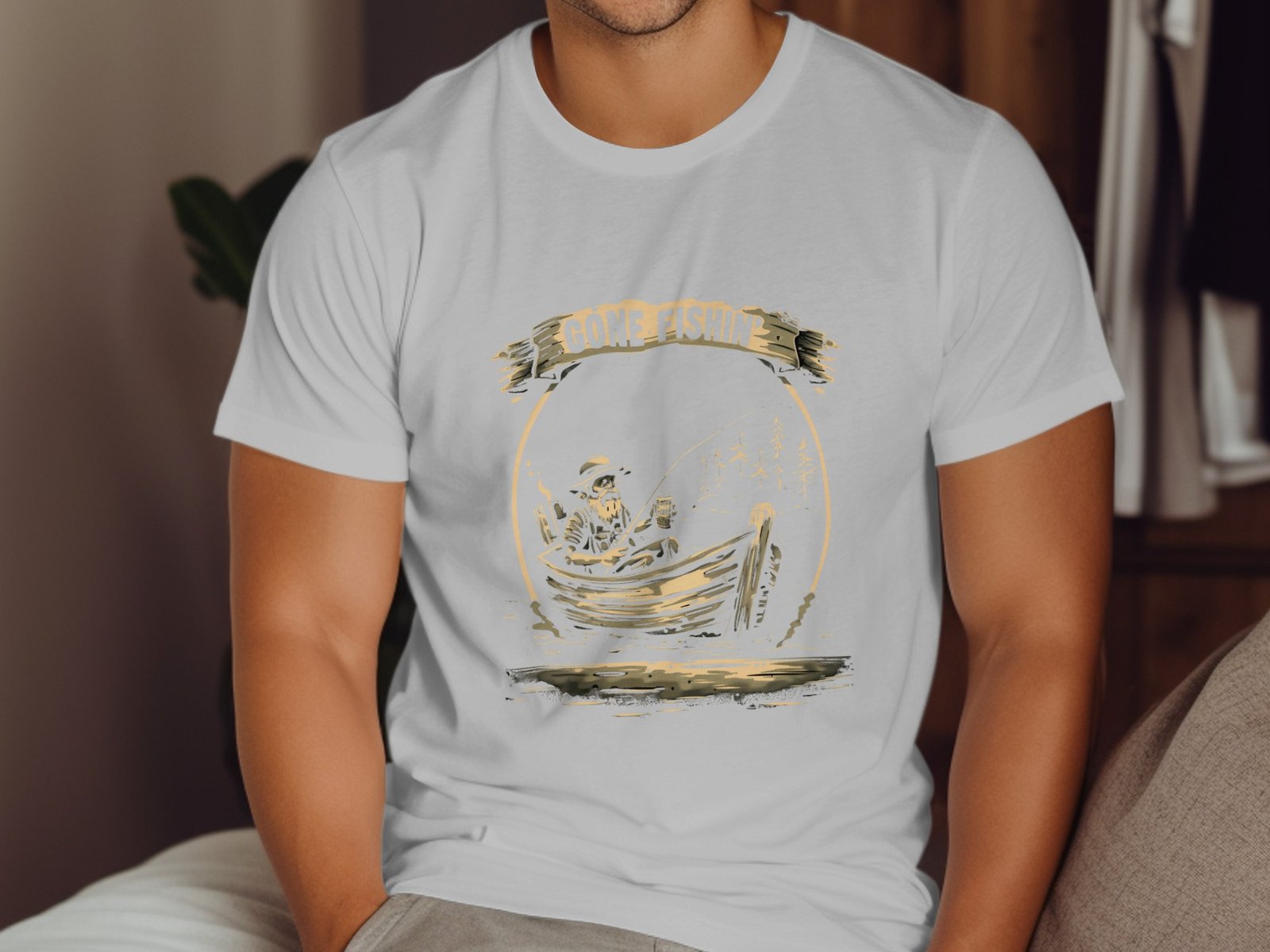 Get your Gone Fishin T-Shirt featuring fisherman with a boat on river design. Perfect for fishing trip and enjoying the great outdoors. Great gift for fishing enthusiast!