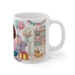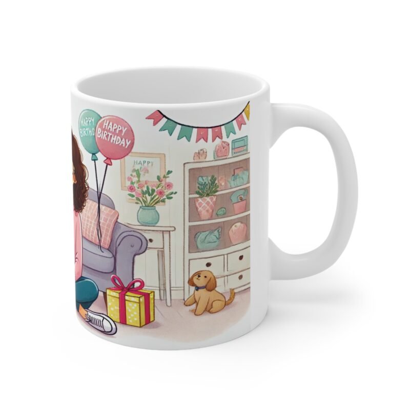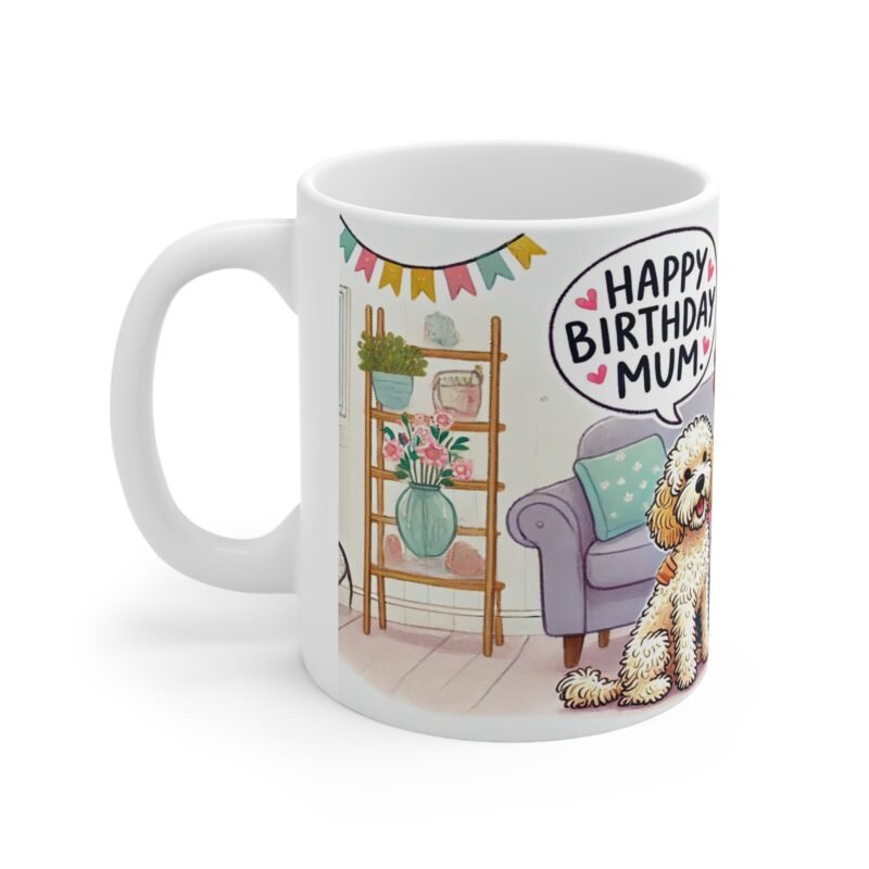 Celebrate your mum’s special day with this adorable mug featuring a curly-haired dog saying “Happy Birthday Mum”! The playful design showcases a cheerful dog sitting beside its owner in a cozy living room, surrounded by festive balloons, presents, and decorations. Perfect for dog-loving mums, this mug is both practical and heartfelt, making it an ideal gift for birthdays. Let your mum enjoy her favorite drink while being reminded of her beloved furry friend.