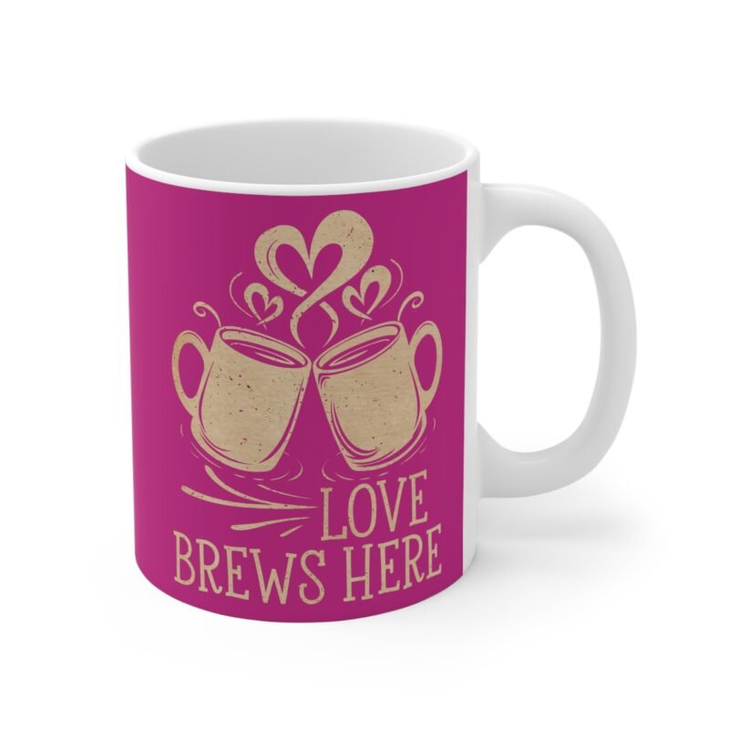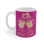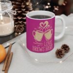 Celebrate love and coffee with this charming “Love Brews Here” pink mug! Featuring an adorable heart and coffee cup design, this ceramic mug is perfect for couples, coffee lovers, and anyone who appreciates a cozy cup of love. Ideal for Valentine’s Day, anniversaries, or as a sweet gift for your partner or loved one. A delightful addition to any coffee routine!