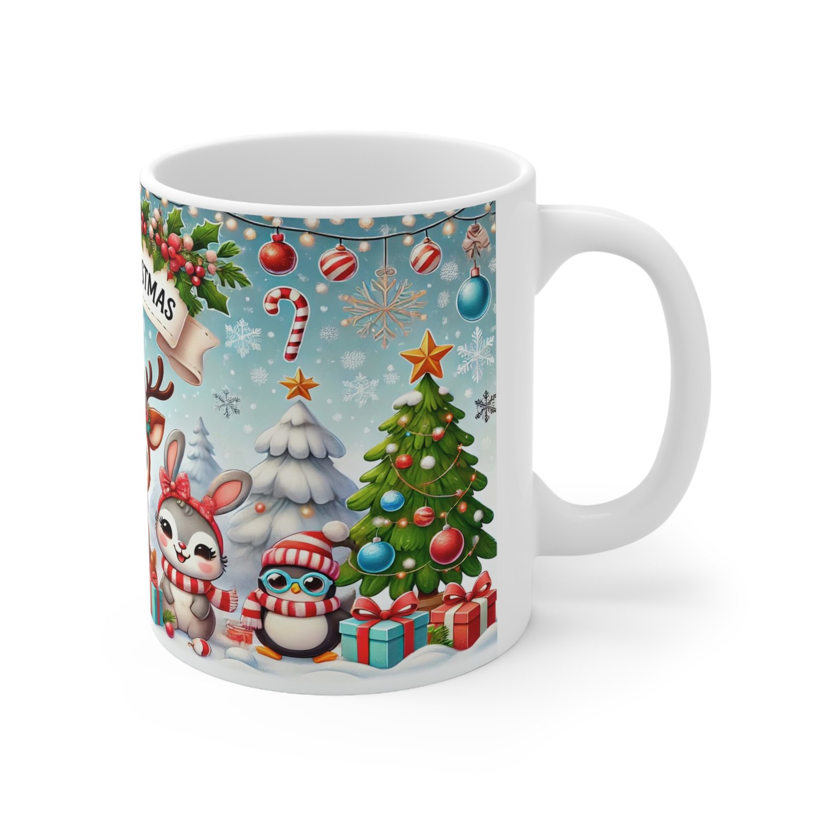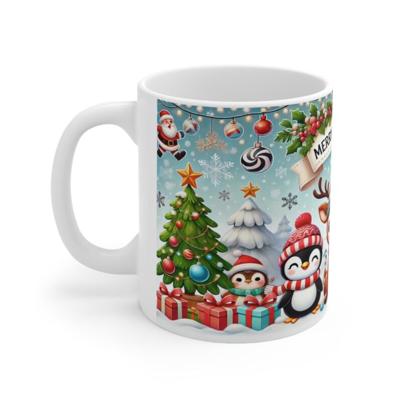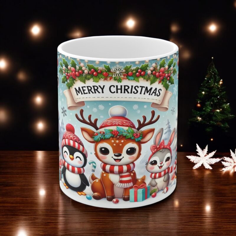Celebrate the season with this adorable “Merry Christmas” mug! Featuring a festive design of a cheerful reindeer, penguins, and a bunny surrounded by holiday decorations, this 11oz mug is perfect for hot cocoa, coffee, or tea. A delightful gift for friends, family, or coworkers, it’s sure to brighten anyone’s holiday spirit. Made from durable ceramic with a vibrant print, this mug is both microwave and dishwasher safe. Perfect for cozy winter mornings or as a thoughtful stocking stuffer.