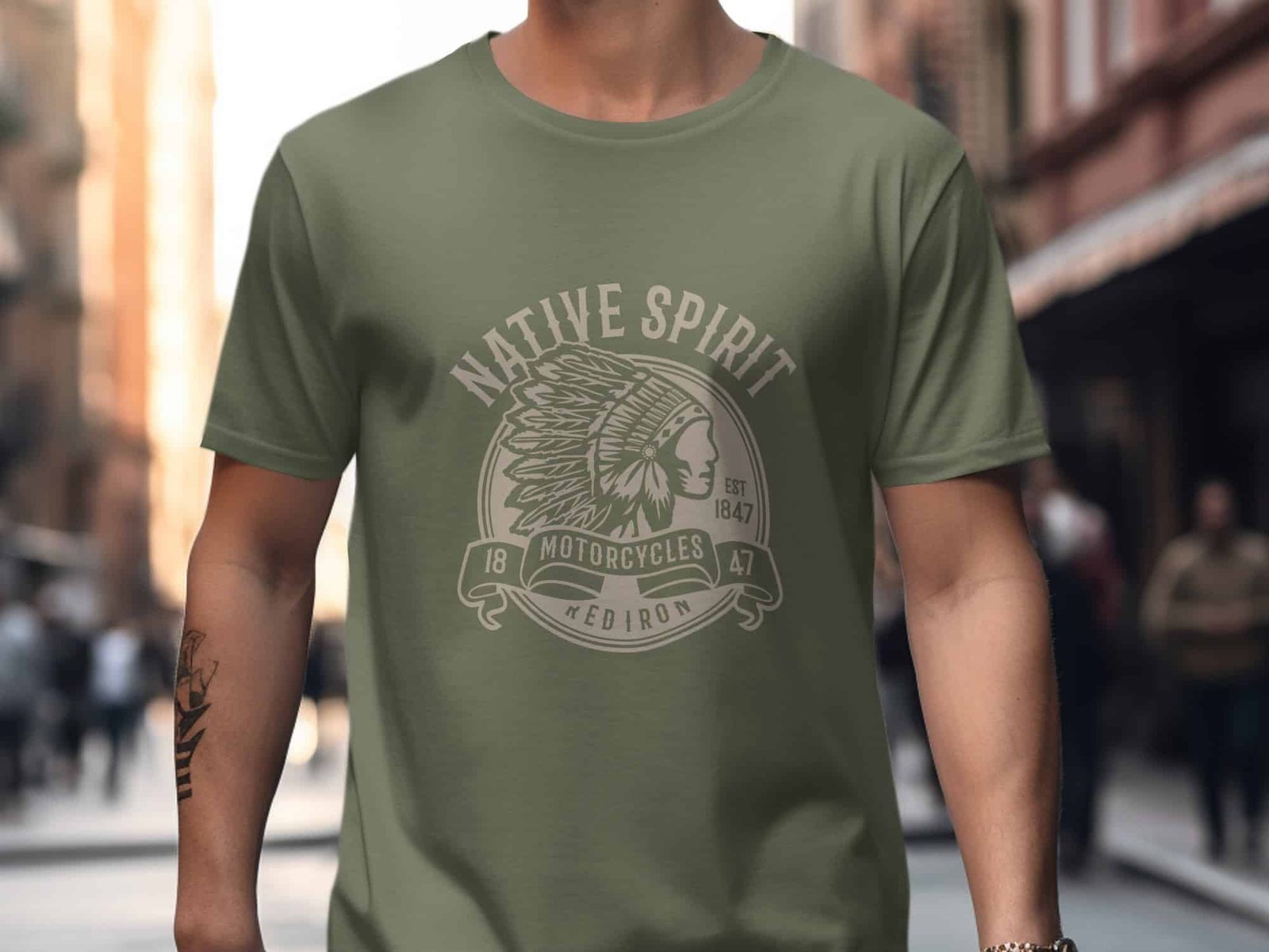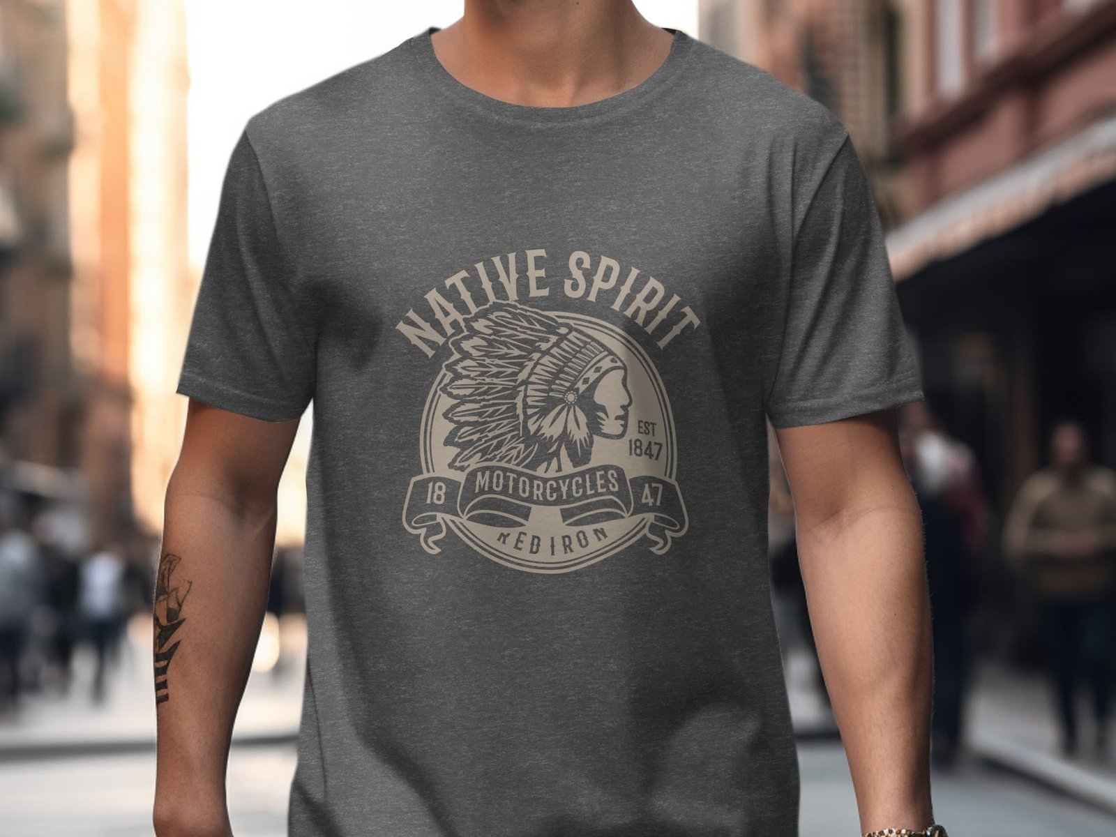 Show off your love for motorcycles and Native American culture with this vintage styled T-Shirt. It features a unique Native Spirit design est 1847 a definite eye catcher.