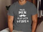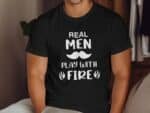 Show off your daring side with our Real Men Play With Fire graphic T-Shirt. This bold design is perfect for guys who aren’t afraid to take risks and have fun. Get your Tee now!