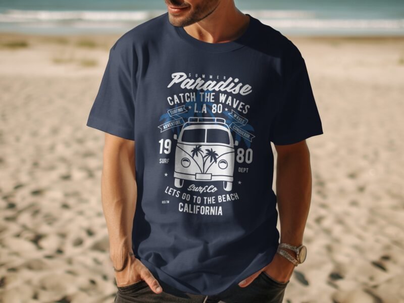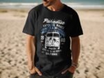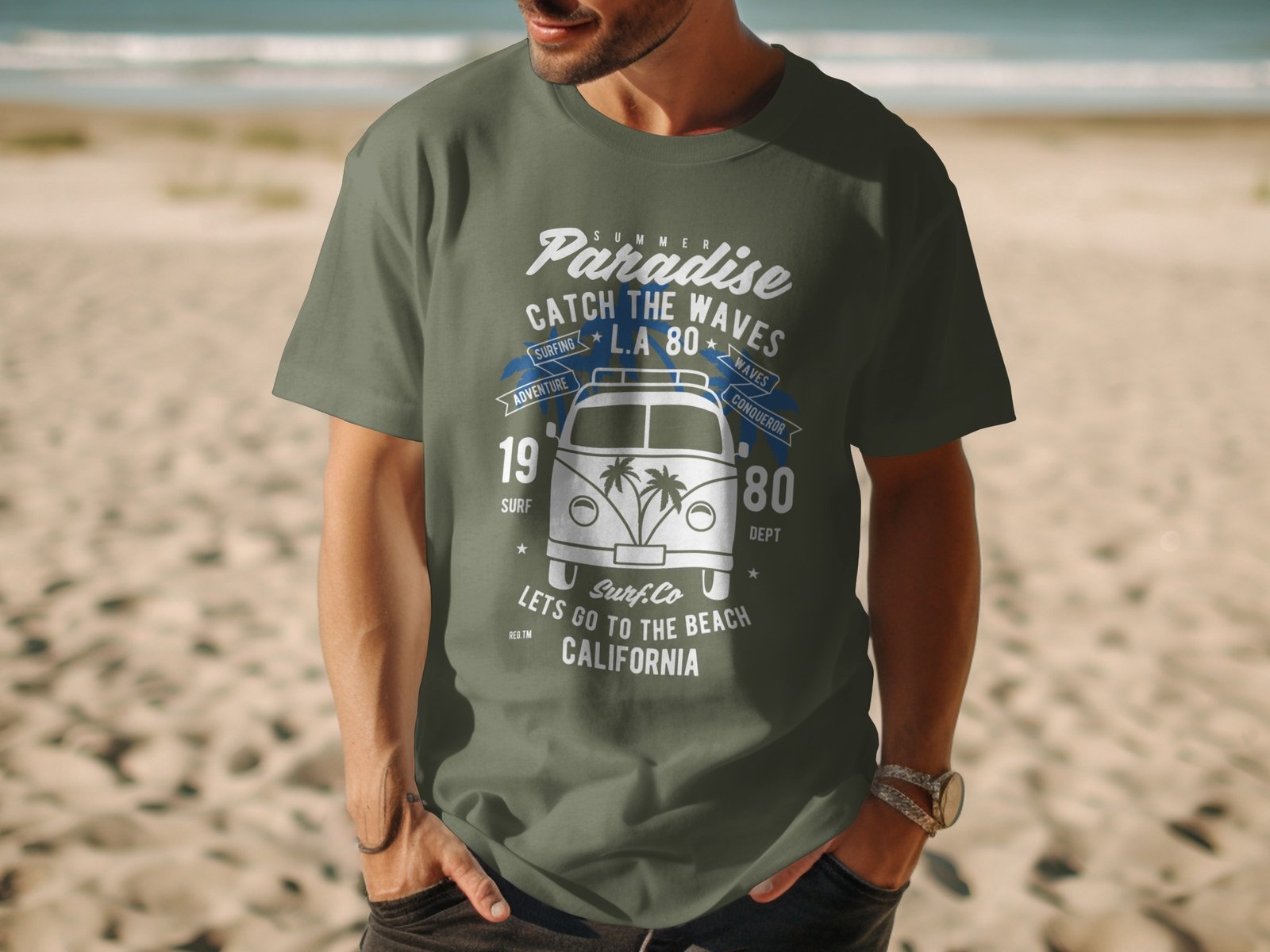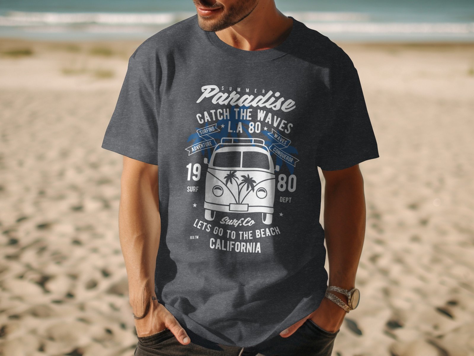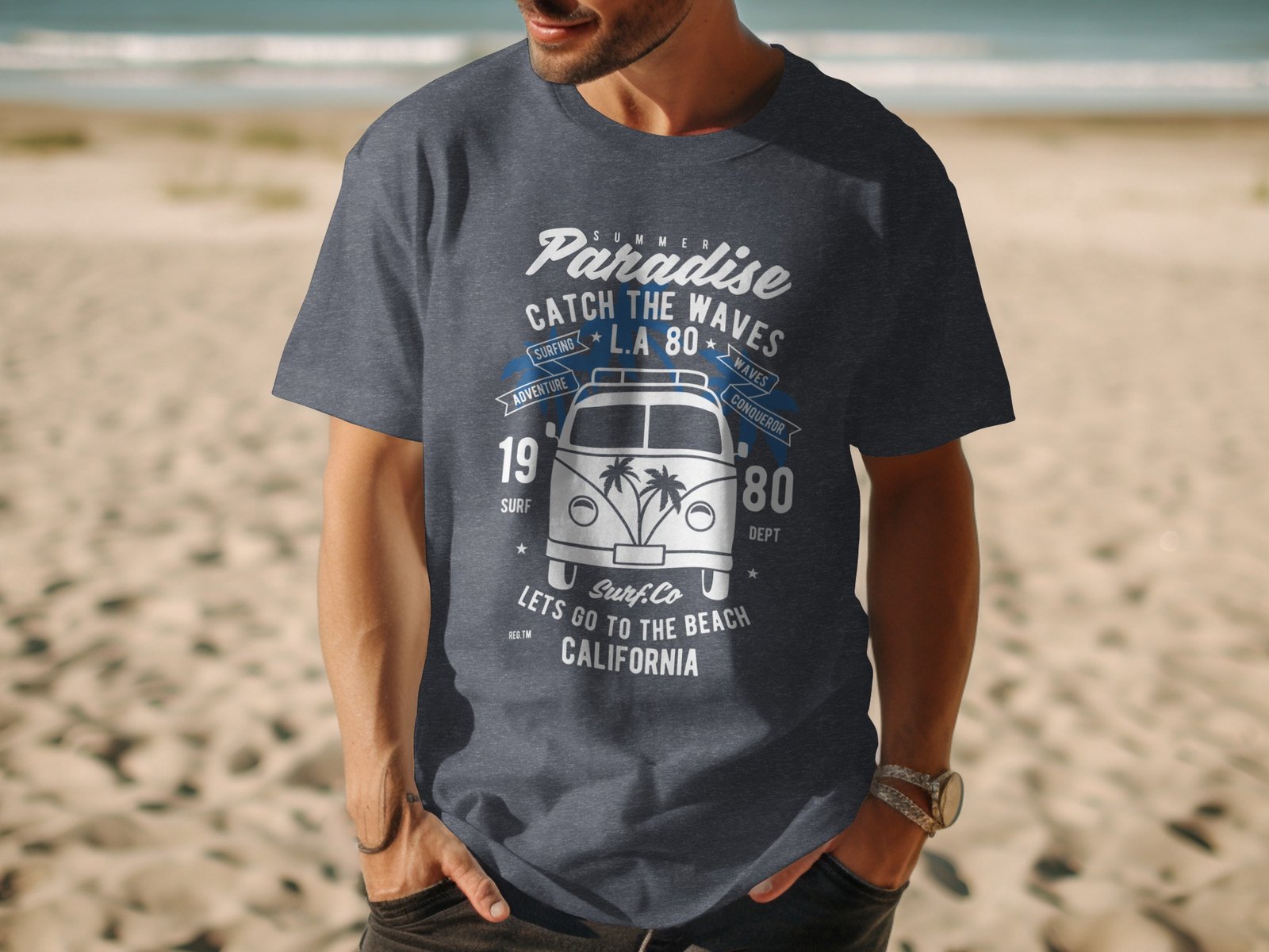 Ride the waves this summer with our paradise themed tee! This design features vintage artwork with a classic surf van for the ultimate beach vibe. Perfect for summer adventures!