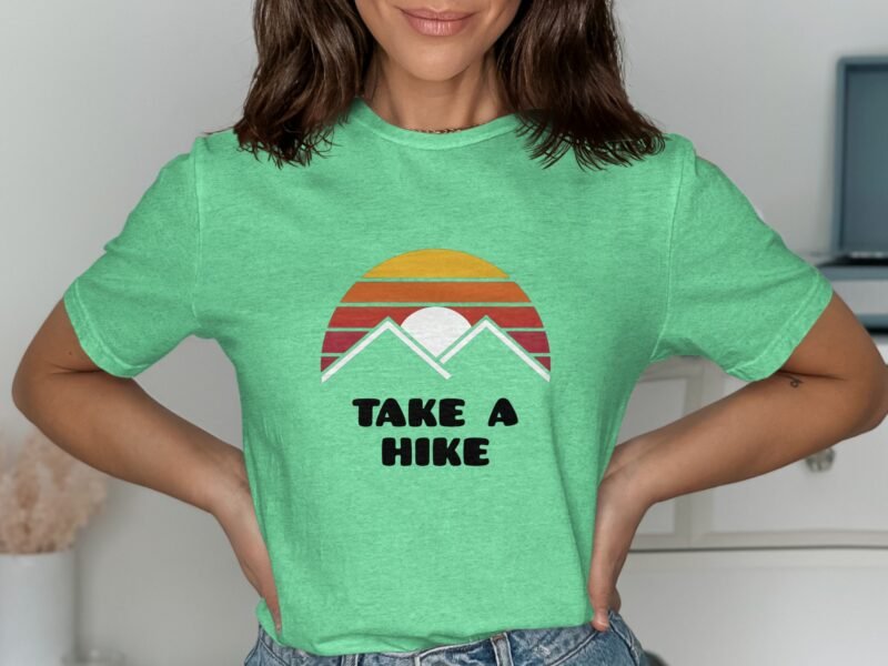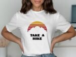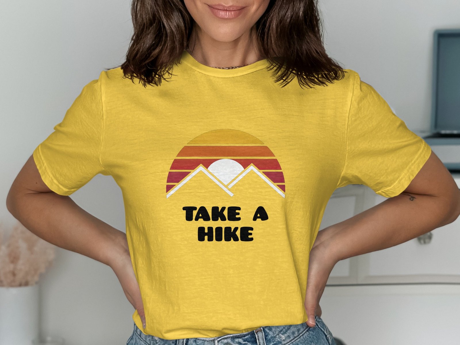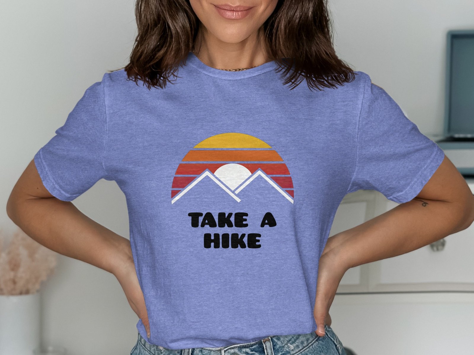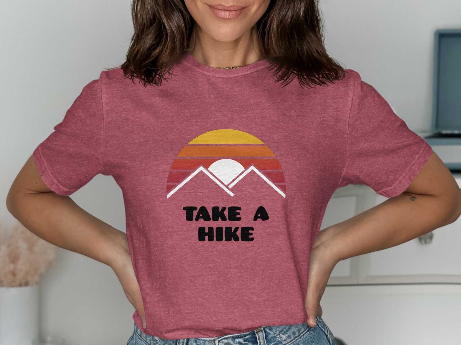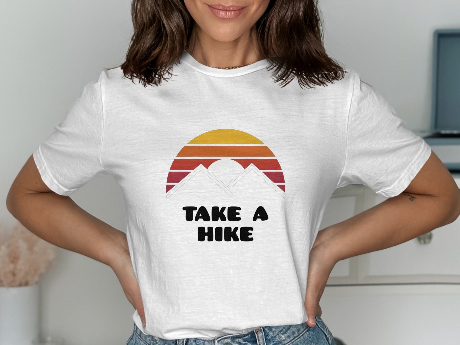 Show your love for the outdoors with this awesome hiking themed design. Features a cool retro sunset and mountain graphic. Perfect for nature lovers Take a Hike T-Shirt.
