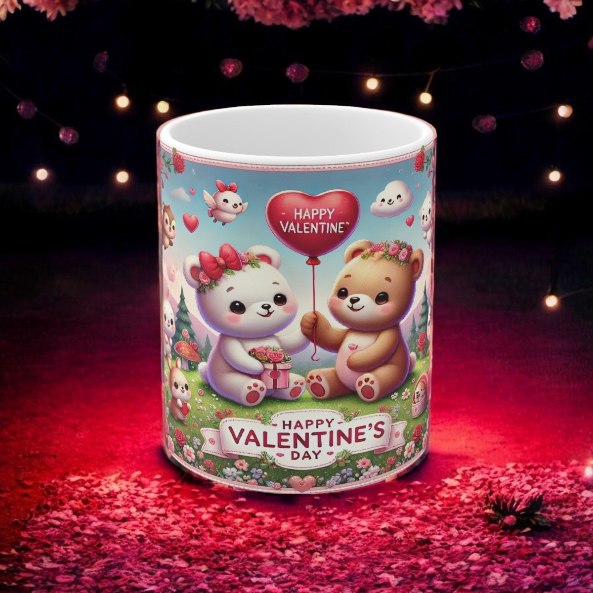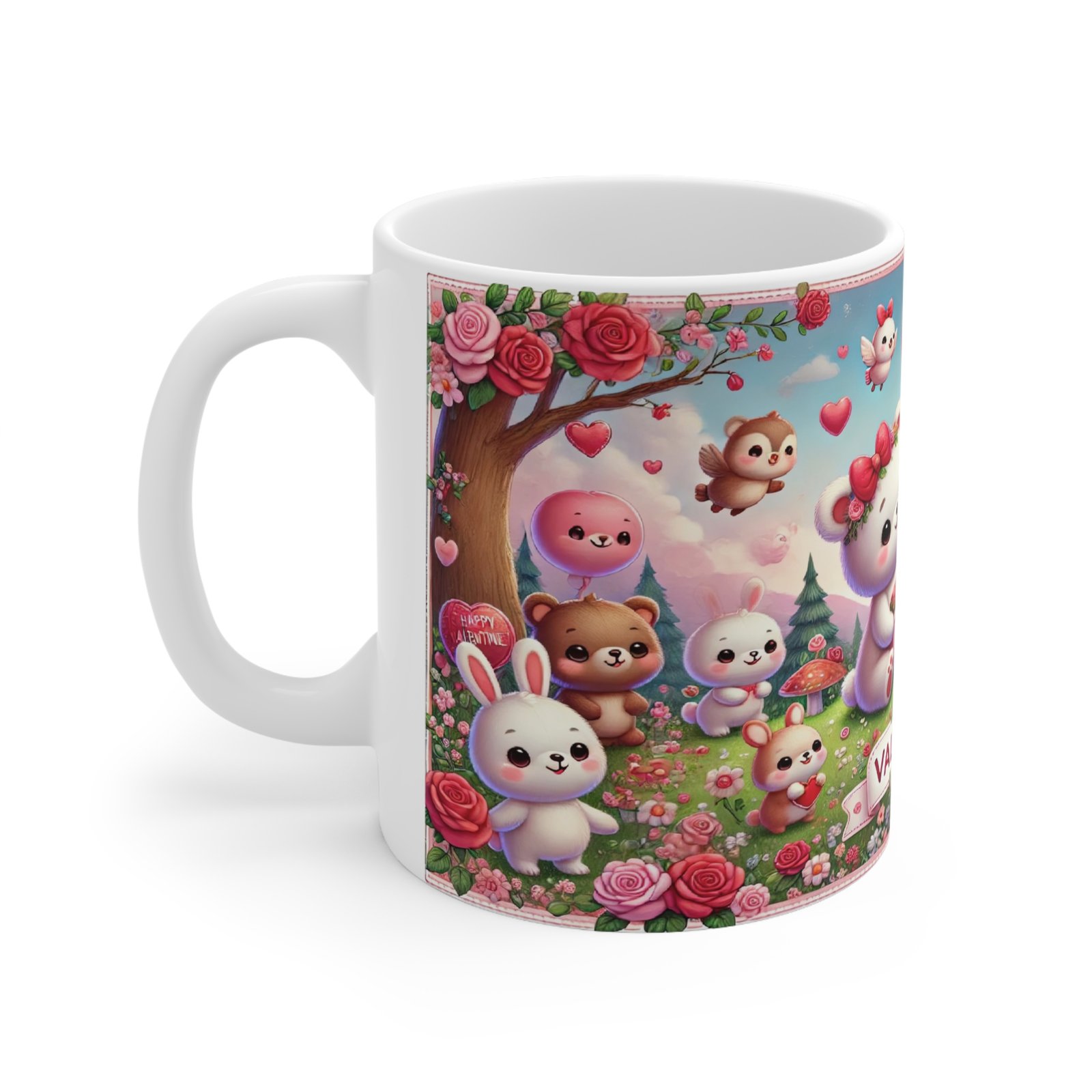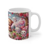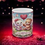Bring joy to Valentine’s Day with this whimsical 11oz ceramic mug featuring an adorable scene of bears, bunnies, heart balloons, roses, and a forest background. This heartwarming design is perfect for couples, friends, or family who love cozy moments with a touch of cuteness. Microwave- and dishwasher-safe, it’s a functional and charming gift for coffee, tea, or cocoa lovers. Add this delightful mug to your Valentine’s Day celebrations or gift it to someone special!