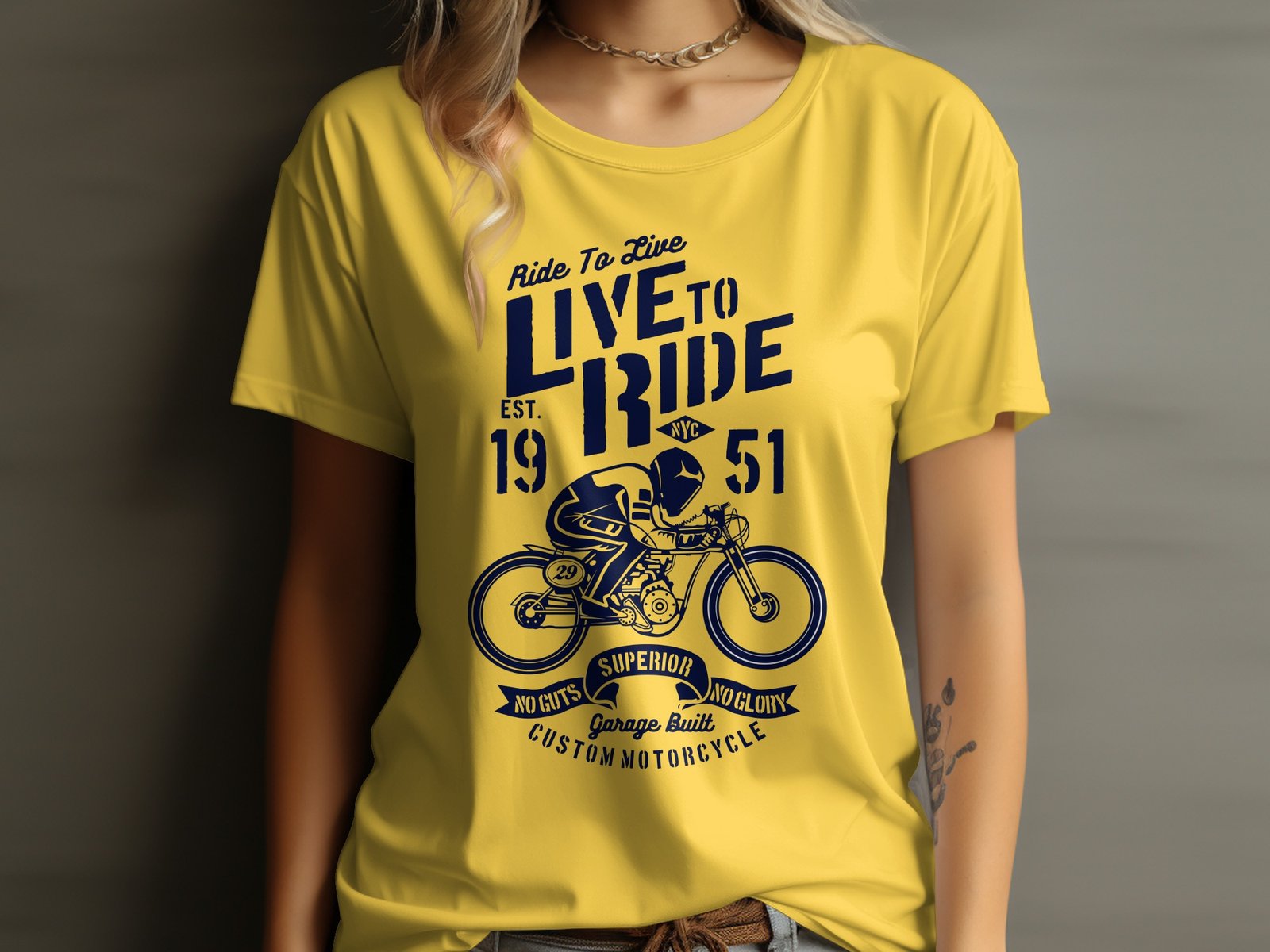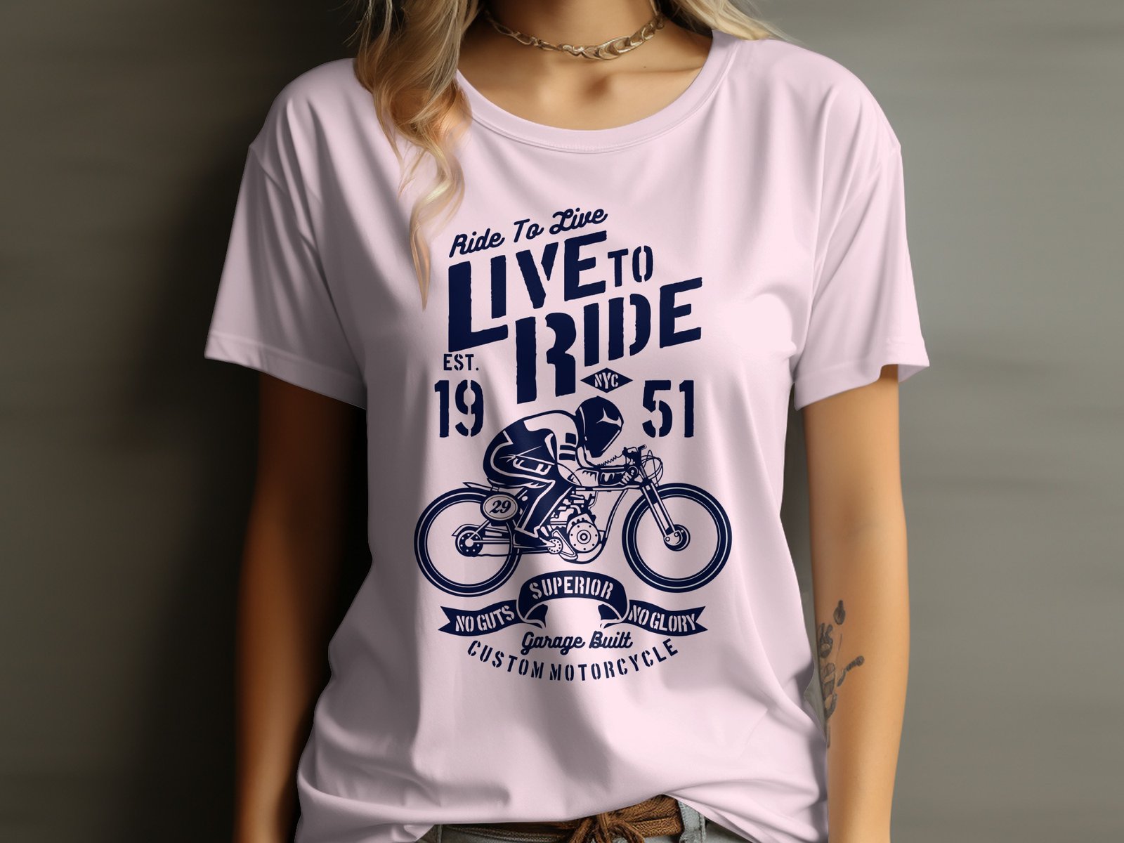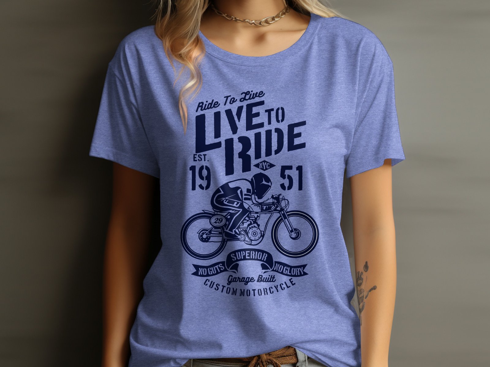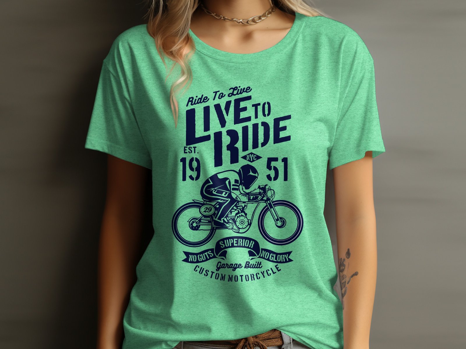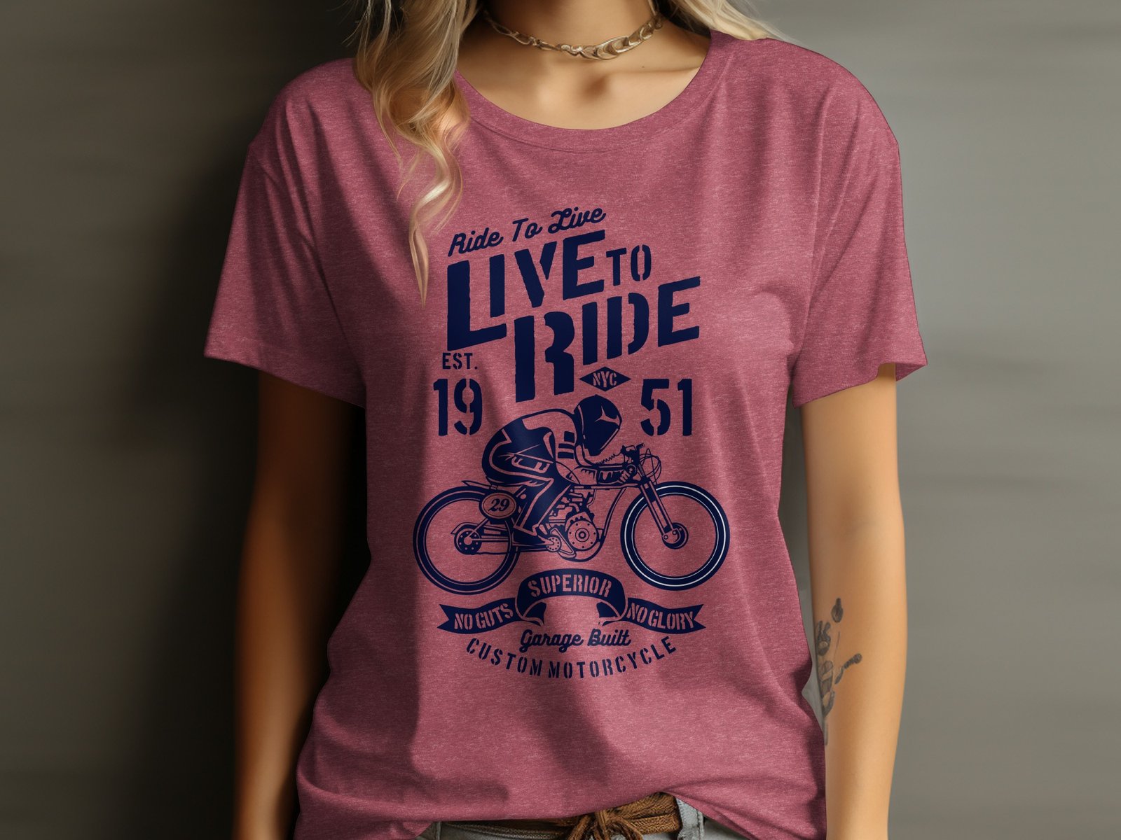 This vintage motorcycle t-shirt features a bold “Ride To Live Live To Ride” graphic with a custom motorcycle design. Perfect for motorcycle enthusiasts, this tee embodies a sense of adventure and freedom. It highlights the spirit of superior craftsmanship with the phrase “No Guts No Glory.” Ideal for casual wear or as a gift for any motorcycle lover, this t-shirt is a must-have addition to any wardrobe. Stand out and embrace the open road with this unique and stylish tee.