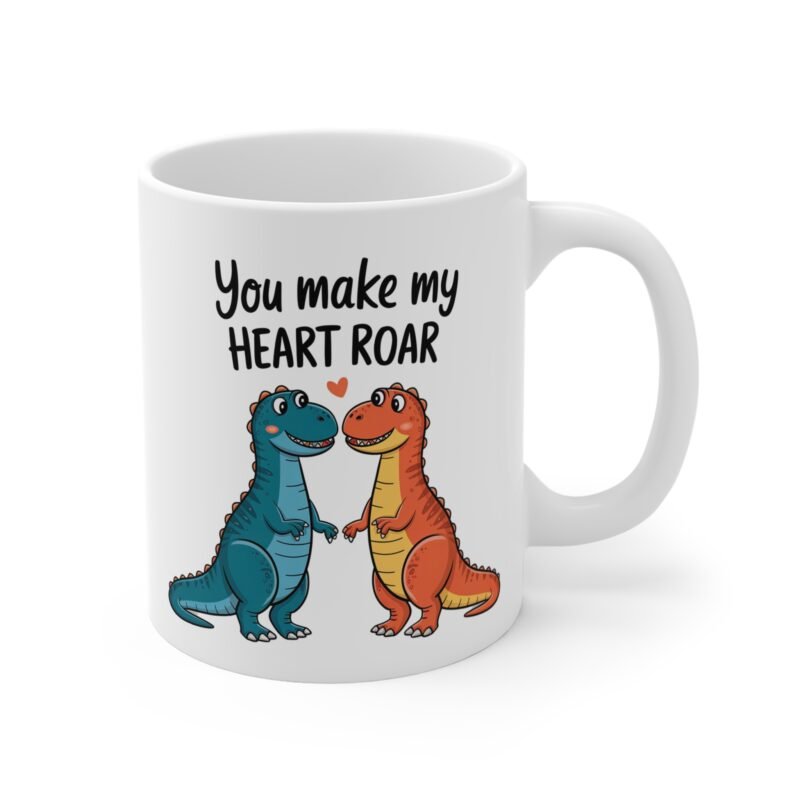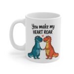 Add a roar of love to your day with this “You Make My Heart Roar” mug! Featuring two adorable dinosaurs—one blue and one orange—holding hands with a small heart above them, this mug is perfect for Valentine’s Day, anniversaries, or any romantic occasion. Great for coffee, tea, or hot cocoa, it’s a thoughtful gift for your partner, friends, or family members who love dinos and fun designs. Durable and easy to clean, this mug is both practical and charming for everyday use.